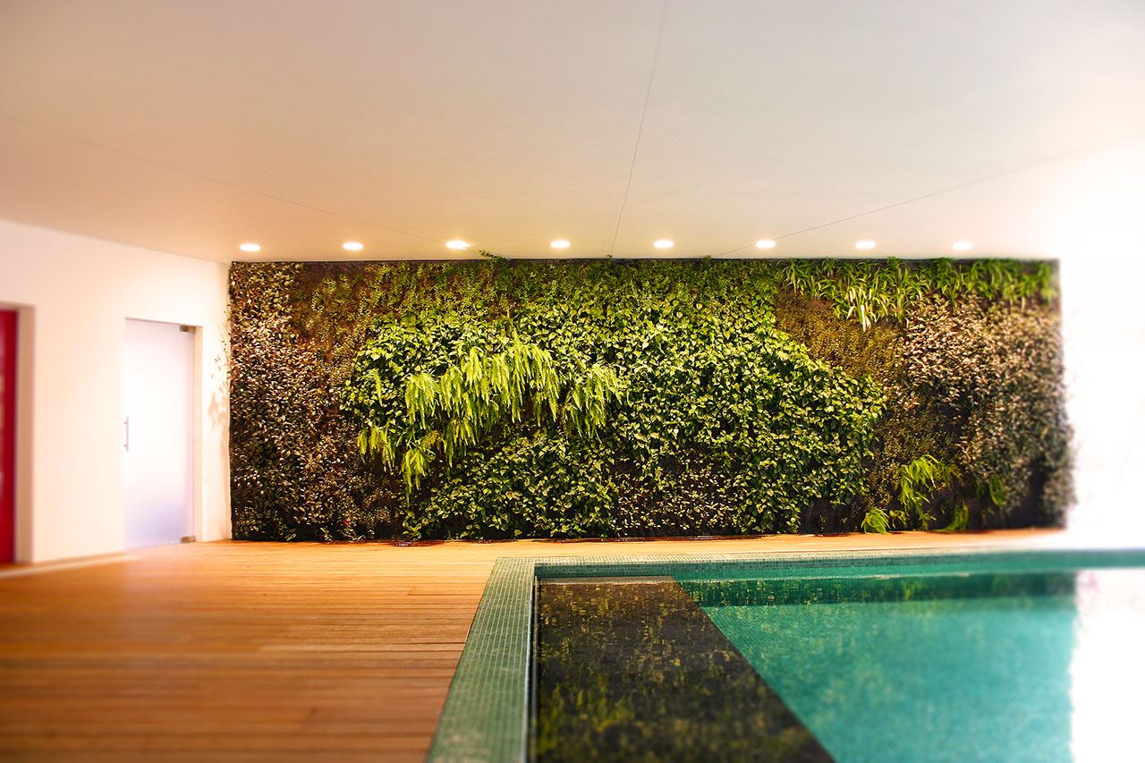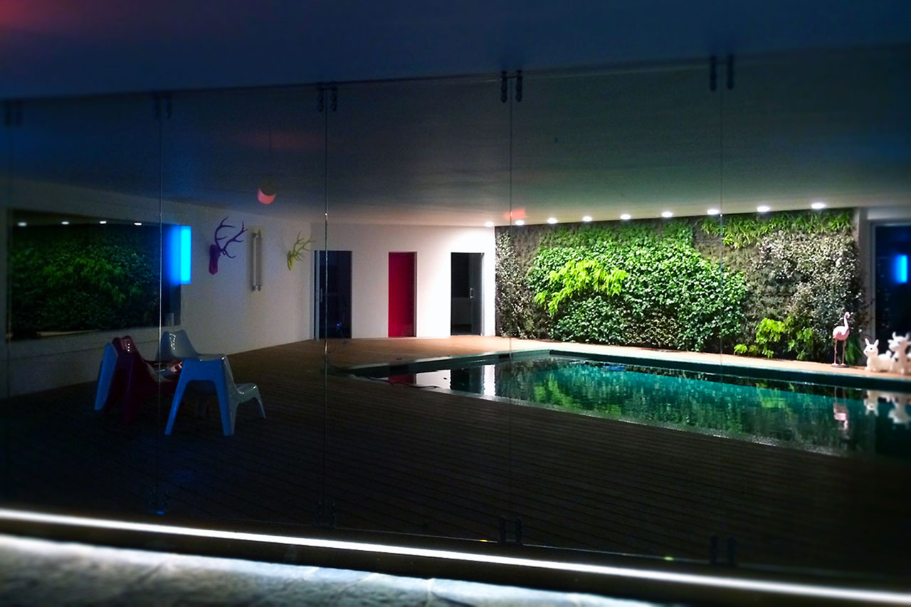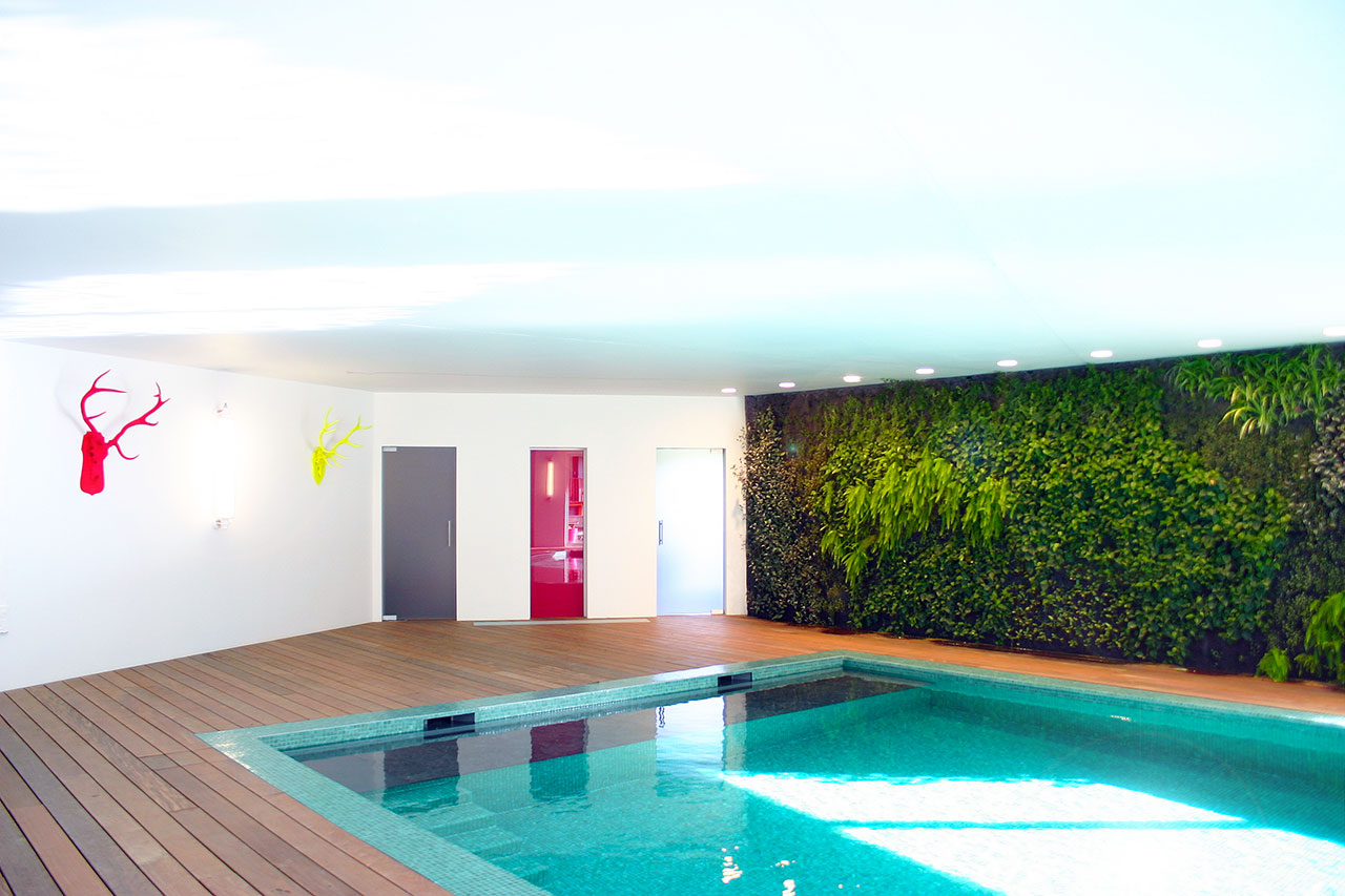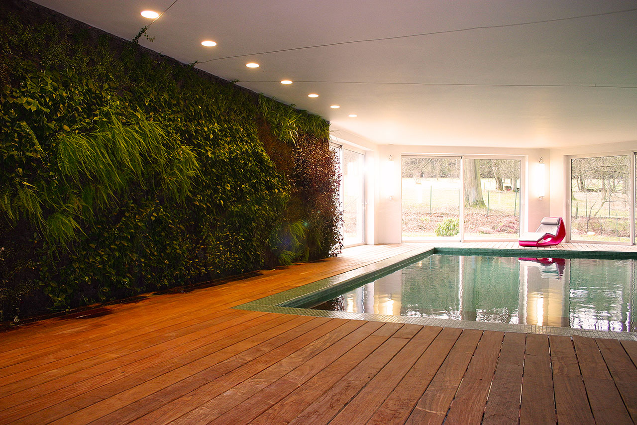 Nous avons pris le parti de mettre en avant la relation entre l'intérieur et l'extérieur, le mur végétal fait pénétrer la nature à l'intérieur du pavillon dédié à la relaxation.